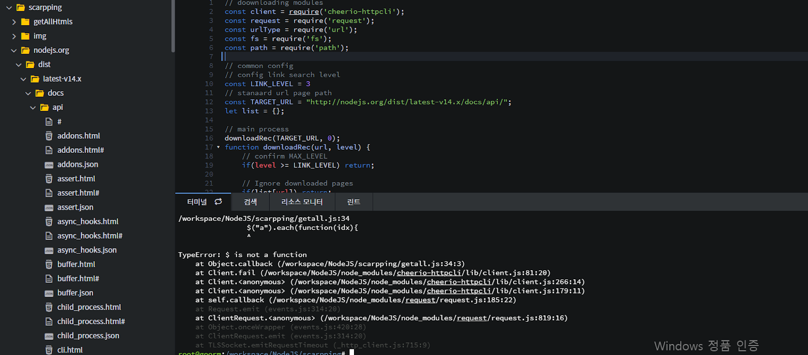 - Node.js의 한글 문서 페이지를 한 번에 다운로드 하는 프로그램 작성