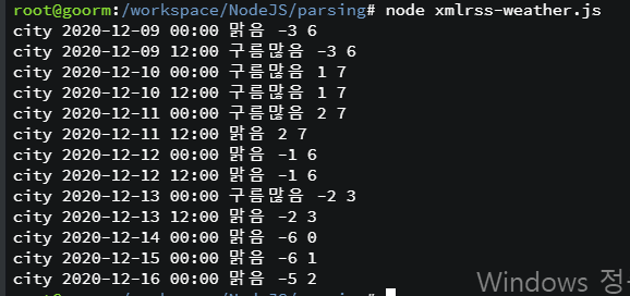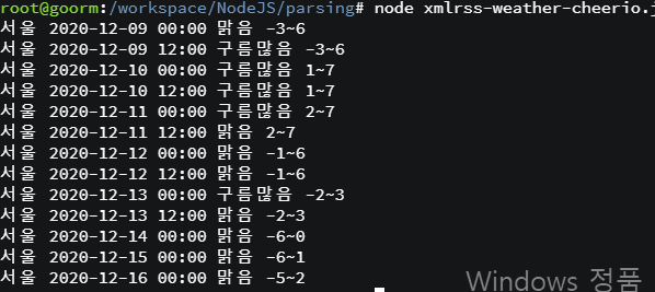 - Node.js에서는 XML을 파싱하기 위해 'cheerio-httpcli' 모듈을 포함하여 여러 가지 모듈이