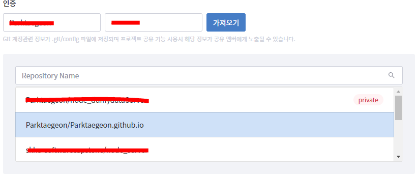 - Github의 id와 비밀번호를 치면 나오는 창입니다. 이 중 자기가 미리 만들어둔 Repository를 선택합니다.