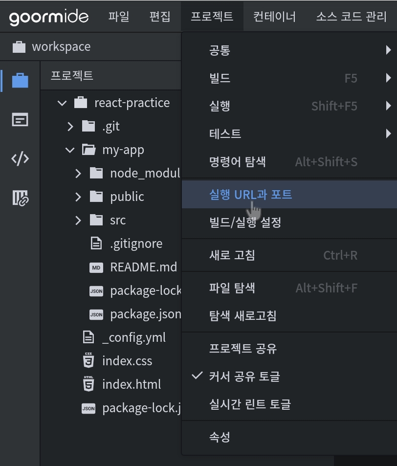 - '프로젝트' 탭의 '실행 URL과 포트'를 클릭합니다.