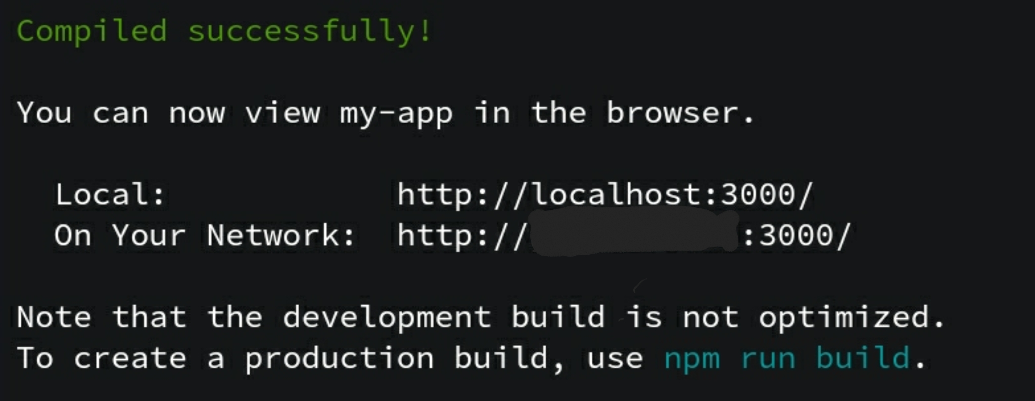 - my-app 폴더로 이동 후, npm start명령어를 입력하여 node server를 실행시킵니다.