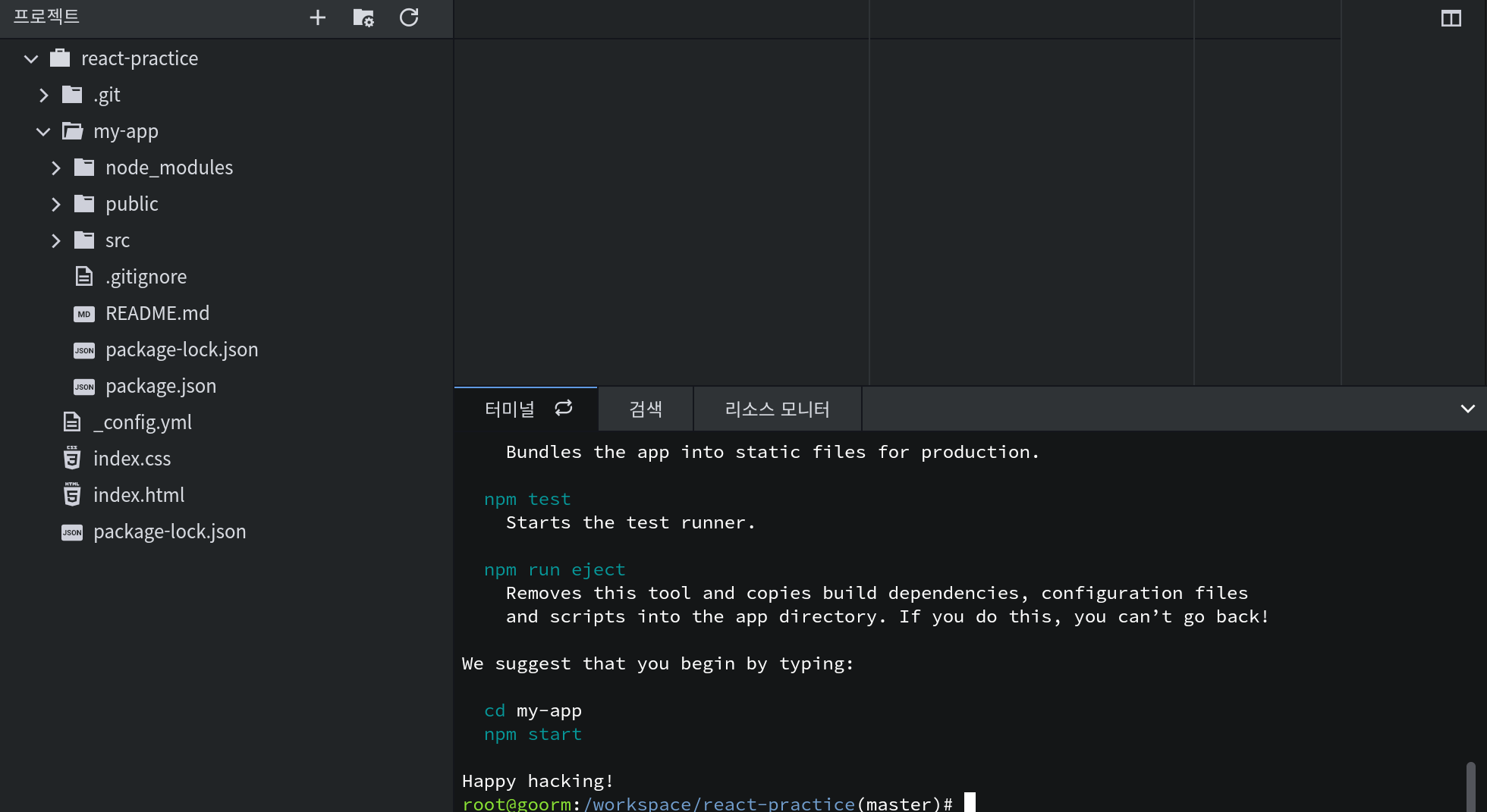 - 처음 구름 IDE에서 React로 Container를 생성시켰을 때 나오는 화면입니다.